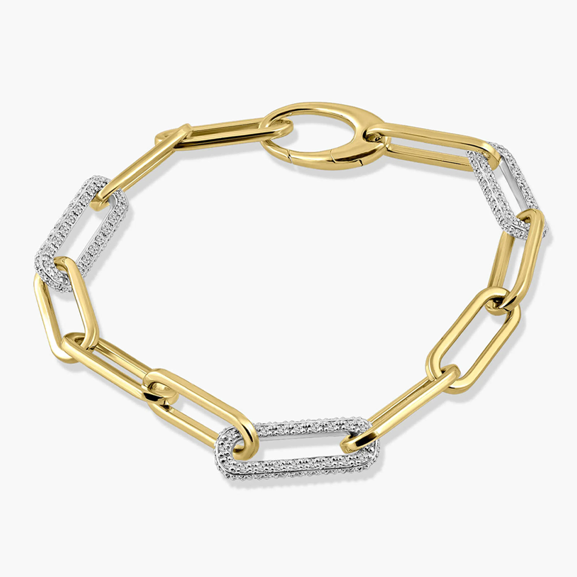 צמיד זהב 14K במראה חוליות עכשווי ומלא נוכחות בשילוב חוליות במספר גדלים ובחיבור שתי וערב ביניהן בשיבוץ זרקונים נוצצים. אורך הצמיד 19 ס"מ.