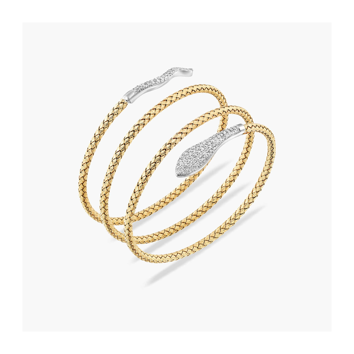צמיד זהב 14 קראט המסתלסל סביב פרק היד ובסופו ובראשו דוגמת ראש וזנב נחש משובצים 110 יהלומים נוצצים וטבעיים.הצמיד גמיש למחצה ומכיל מתכות נוספות בנוסף לזהב על מנת לשמור על גמישותו.