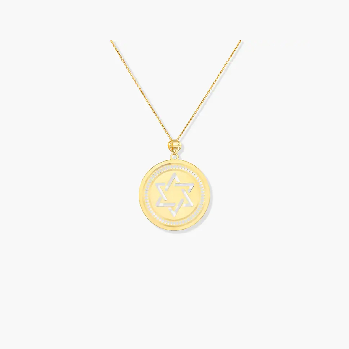 תליון זהב 14K המעוצב כמגן דוד במסגרת עגולה מזהב בקוטר 3 ס"מ. קוטר המגן דוד בתוך העיגול 1.8 ס"מ